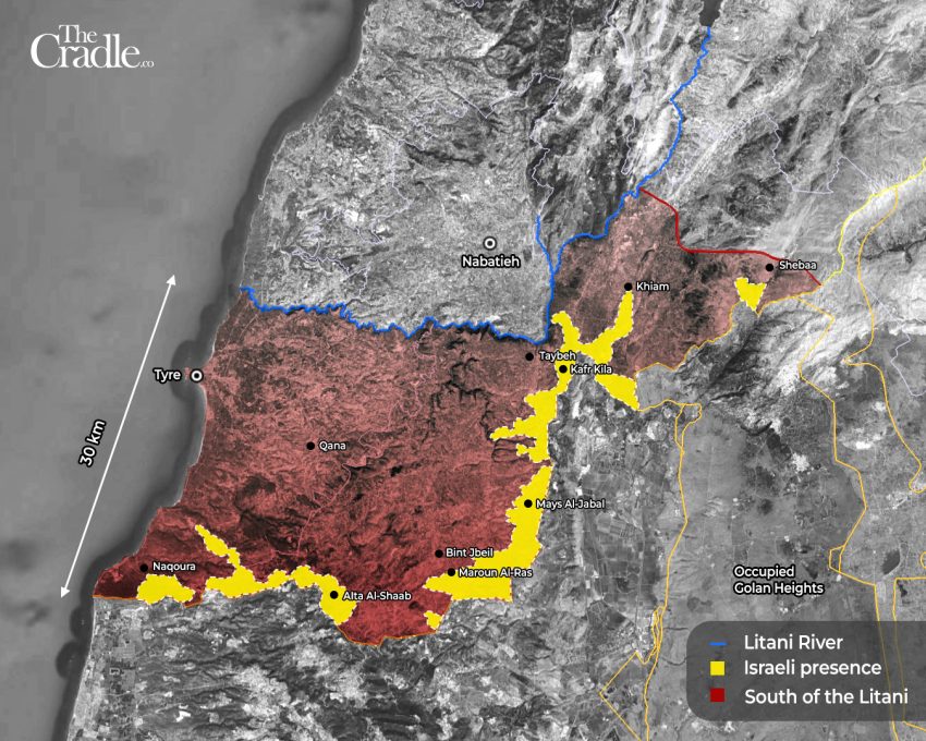 Map showing areas of Israeli military presence (in yellow) south of the Litani River in southern Lebanon, following the declared ceasefire. (Updated December 2024)