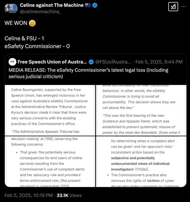 But the X user, Celine Baumgarten, managed to convince the Administrative Review Tribunal the censorship notice should not be considered “informal” and that her complaint was therefore within the tribunal’s jurisdiction.
