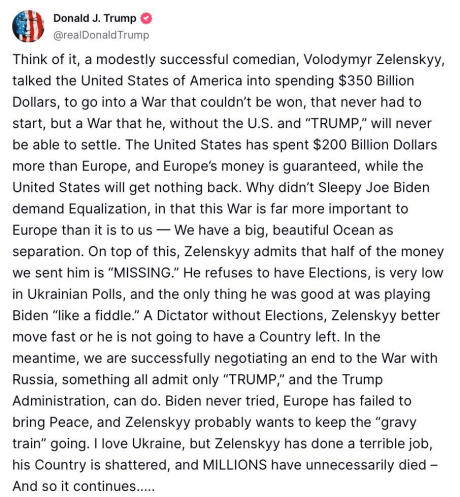 Now, with Trump in power, it appears Zelensky’s claims that they share the same vision for Ukraine was far from reality. In fact, Trump is now openly calling Zelensky a “dictator” and is looking to settle the conflict as soon as possible, without Zelensky even having a seat at the table.