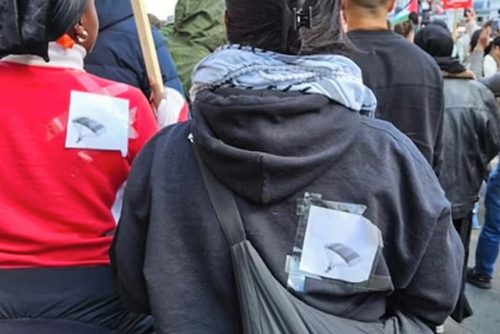 - Next is Clothing: It is an offence to ‘wear clothing or carry or display articles in public in such a way or in such circumstances as to arouse reasonable suspicion that the individual is a member or supporter of a proscribed organisation’. Articles of clothing are also not in themselves acts of terror, no matter how they are displayed. Obviously, what they have in mind here is branding relating to specific organisations, such as a Hezbollah flag, a Qassam Brigades head band, or other perhaps less directly connected imagery or items. Obviously, given the attemtps of the Zionists and their craven allies in the British security state, there is a push to widen the parameters so they can scoop up more and more supporters of the Palestinians. Thus the case of the young women found guilty under these powers of sporting parachute patches (below).