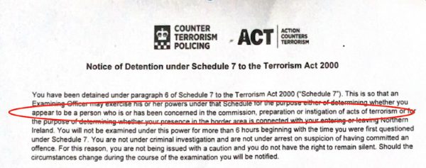 When I was detained by officers of SO15 or the Counter Terrorism Command (formerly the Special Branch) under Schedule 7 the other day, I was given a piece of paper with the legal basis of the detention which I was required to sign and was given a copy to keep. It states that the detention is to enable whether I appeared ‘to be a person who is or has been concerned in the commission of instigation of acts of terrorism.’
