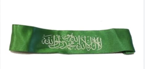 Or, the case of the young man found guilty of supporting Hamas for wearing a green headband with the Shahada (the Muslim profession of faith) on it (first below). This is of course not a ‘Hamas headband’. Al-Qassam Brigades, the military wing of Hamas, do have a specific headband with a gun on it! As can be seen, it is not at all similar (right below).