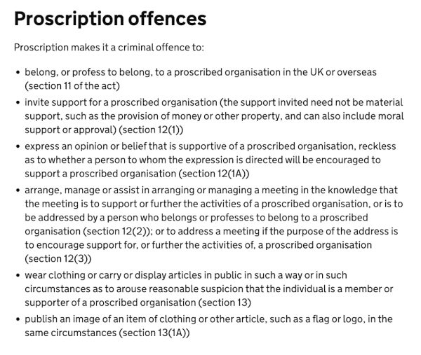 But the reason for this is that Schedule 7 is not really intended to disrupt actual terrorism, but to surveill and repress political views and political speech which is critical of UK foreign policy, including of course support for the Palestinians’ legitimate right to resist the Zionist occupation. Don’t believe me? Let’s look closely at the Home Office list of offences related to proscribed organisations.