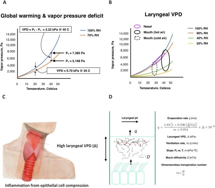 Global warming increases water evaporation rates from planetary ecosystems. Here, we show that evaporation rates encountered during human breathing in dehydrating atmospheres promote airway inflammation and potentially exacerbate lung diseases.