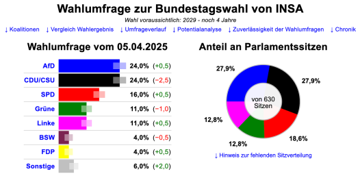 It has finally happened: Alternative für Deutschland are no longer the second-strongest party in Germany; for the first time ever, they have pulled dead-even with CDU/CSU in a representative poll. Both claim 24% support in the latest INSA survey, conducted for BILD between 31 March and 4 April. It is the strongest poll result the AfD have ever received.