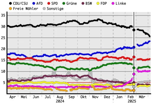 The election might be over, but make no mistake – these poll results matter. First, collapsing support deprives the CDU of options in the present. They can’t walk away from the negotiating table and seek new elections, because they know they’d come out of them vastly worse. Their terrible numbers further strengthen the negotiating position of the SPD, who will force the CDU to accept still more damaging compromises, driving CDU support even lower. Then we must remember that federal elections are not the only game in town. The rank-and-file of the CDU have to contend in an array of district elections in the coming months, and five state elections are approaching in 2026, including two in East Germany (Mecklenburg-Vorpommern and Sachsen-Anhalt) that may well end in the collapse of the firewall at the state level. Dissatisfaction with Merz inside the CDU is widespread and growing.