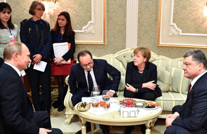 Putin, French President Francois Hollande, German Chancellor Angela Merkel, Ukrainian President Petro Poroshenko at the Normandy format talks in Minsk, Belarus, Feb. 12, 2015. (Kremlin)
