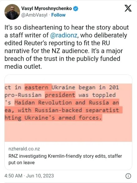 In a Twitter/X post, Luppen complained that RNZ had republished a Reuters article authored by the news agency’s Moscow bureau chief Guy Faulconbridge, with “utterly false, Russian propaganda” inserted. Namely, that the February 2014 Maidan “revolution” was in fact a “violent” US-sponsored “colour revolution,” provoking a civil war in eastern and southern Ukraine, during which local “ethnic Russians” were “suppressed.”