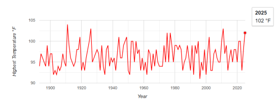 Figure: Hottest annual temperatures recorded in Boston, Massachusetts for each year between 1893 and 2025.