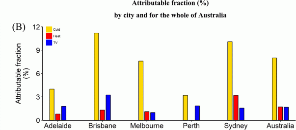 Attributable fraction of deaths: Heat, cold and temperature variability together resulted in 42,414 deaths during the study period, accounting for about 6.0% of all deaths. Most of attributable deaths were due to cold (61.4%), and noticeably, contribution from temperature variability (28.0%) was greater than that from heat (10.6%). (Cheng et al)