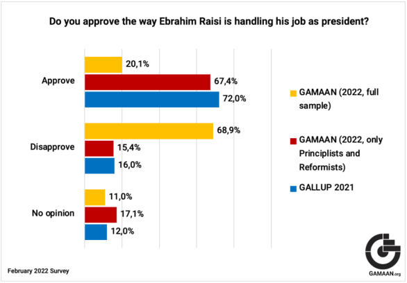 For instance, in a 2022 survey on Iranians’ political beliefs, GAMAAN reported far lower approval ratings for then-president Ebrahim Raisi compared to those reported by Gallup in a 2021 survey. GAMAAN itself highlighted this divergence (illustrated in the graphic below), but wrote that “both surveys are substantially similar … if Gallup’s results are compared with only the Principlists and Reformists in GAMAAN’s sample” (meaning, responses from more conservative and incrementalist participants in GAMAAN’s survey align with Gallup’s findings across its entire sample).