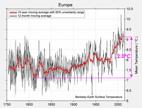 Berkeley Earth average European temperature showing a 2.0°C rise since about 1820. Source: http://berkeleyearth.lbl.gov/regions/europe