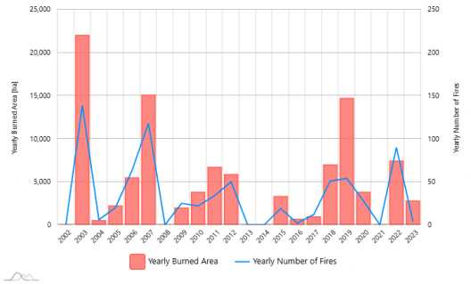 Chart of United Kingdom yearly burned area and number of fires from Copernicus
