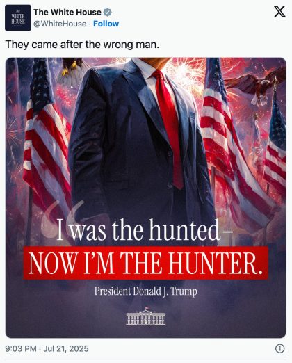 In a graphic promoted by the White House’s official Twitter/X account on July 21, 2025, Trump implied that he had begun to turn the tables on his would-be Iranian assassins: “I was the hunted, and now I’m the hunter,” he declared.