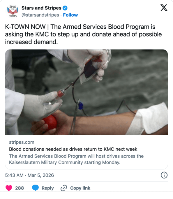 K-Town refers to Kaiserslautern, a US Army base in Germany, which is located 13 miles east of the Landstuhl Regional Medical Center. So what? Well, on March 4, 2026 the Landstuhl Regional Medical Center (LRMC) in Germany—the largest US Department of Defense hospital outside the United States and the primary overseas trauma/evacuation hub for injured service members from Europe, the Middle East, and Africa—sent out a memo announcing the temporary suspension of its labor and delivery services “until further notice.” The memo did not explicitly define the “primary objective,” but LRMC’s core role is treating combat- and training-related injuries. It also is the main medical evacuation point for wounded troops from ongoing operations.