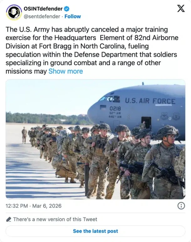 First let me explain the meaning of the X message and photo that appears above… the cancellation of the training exercise is a key indicator that the Pentagon is going to deploy some, if not all, of the 82nd Airborne Division to the Persian Gulf. Final destination unknown. You may recall an article I wrote on February 18 when I reported that a CENTCOM exercise scripting conference, which was scheduled to begin on Sunday, 22 February 2026, had been abruptly cancelled. Six days later the war started.