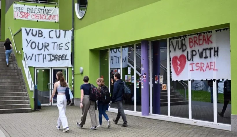 Demonstrators hung a large banner reading “VUB helps kill Palestinians” and placed portraits of Palestinian figures across the campus, accusing the university of complicity through its research partnerships, Flemish-language daily Het Nieuwsblad reported.