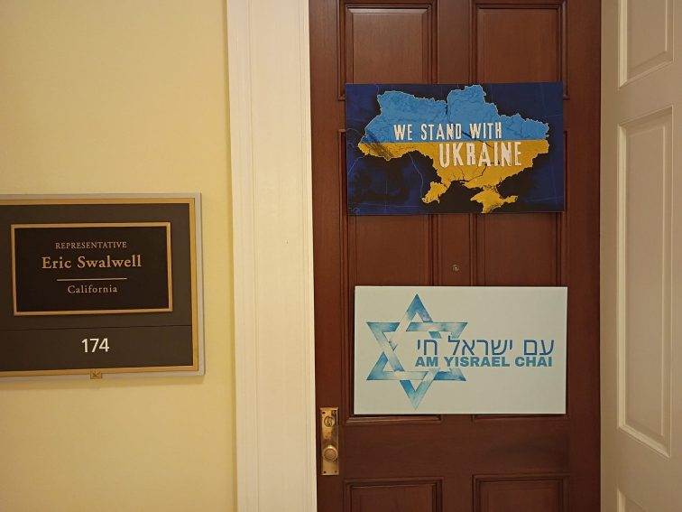 Eric Swalwell’s office door highlights his utility to the forces that propelled his career.