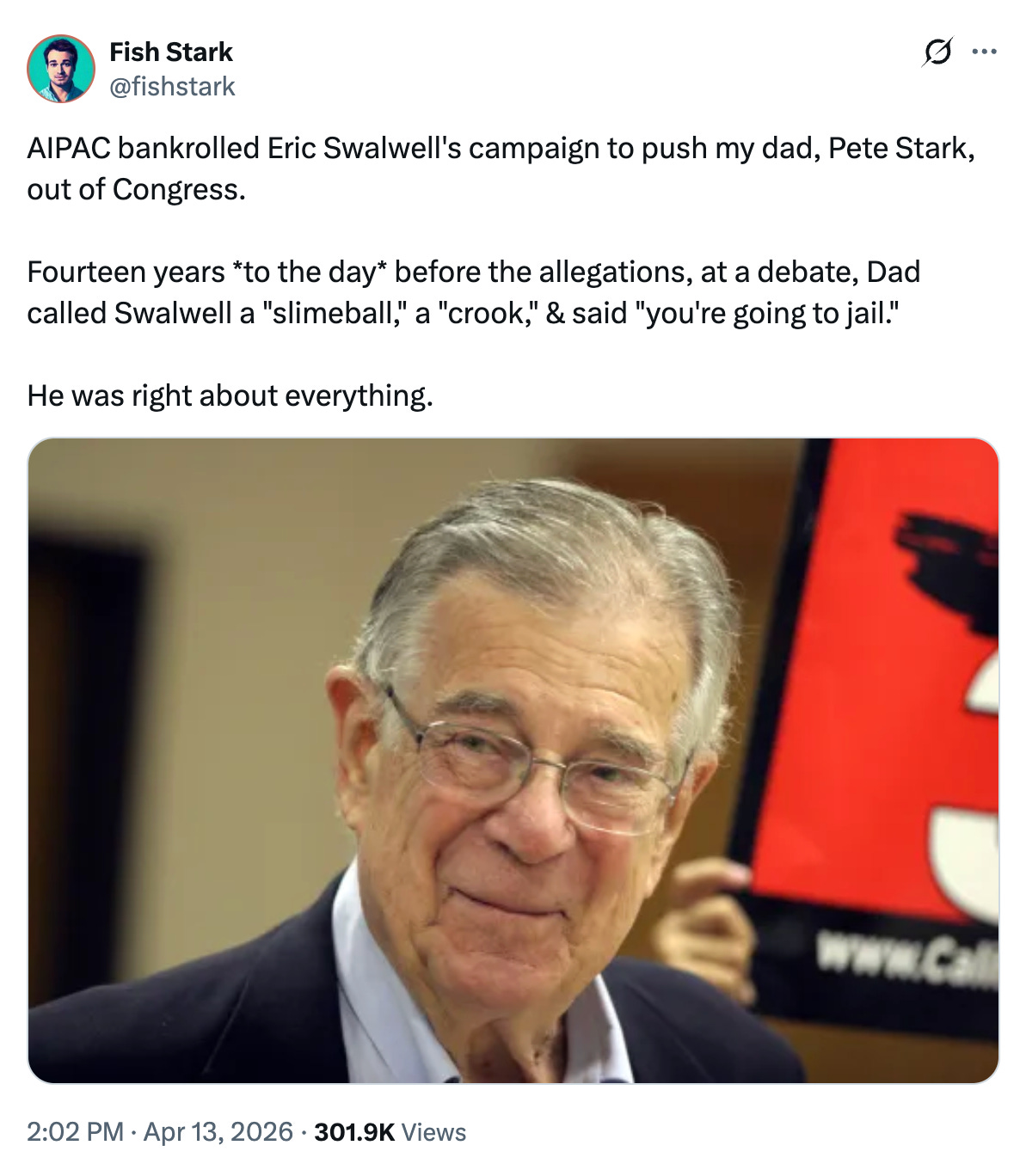 With Swalwell’s demise, Pete Stark may have gotten the last laugh. But in a Democratic Party that is hostile to class politics, overrun by corporate lobbyists and occupied by Israel, Swalwell was a prototype. In his wake, new slimeballs will rise to the surface.