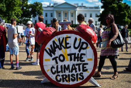 WASHINGTON, DC – JUNE 1: A replica of a clock is seen at Lafayette Square as people gathered to protest President Trump announcement that U.S. will pull out of the Paris climate agreement on Thursday, June 1, 2017 in Washington, D.C. (Photo by Salwan Georges/The Washington Post via Getty Images)