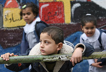 TO GO WITH AFP PACKAGE ON GAZA WAR ANNIVERSARY Palestinian schoolchildren walk out of their UN-run school at the end of classes in Beit Lahia in the northern Gaza Strip on December 16, 2009. The main UN Relief and Works Agency (UNRWA) centre and several schools were destroyed by Israeli bombing during last winter’s three-week war, which killed some 1,400 Palestinians and flattened large areas of the Gaza Strip. AFP PHOTO/MOHAMMED ABED (Photo credit should read MOHAMMED ABED/AFP/Getty Images)