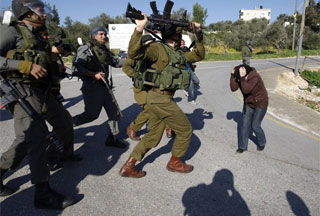 An Israeli soldier raises his weapon towards a Palestinian woman in the West Bank village of Nabi Salih, near Ramallah, January 22, 2010.