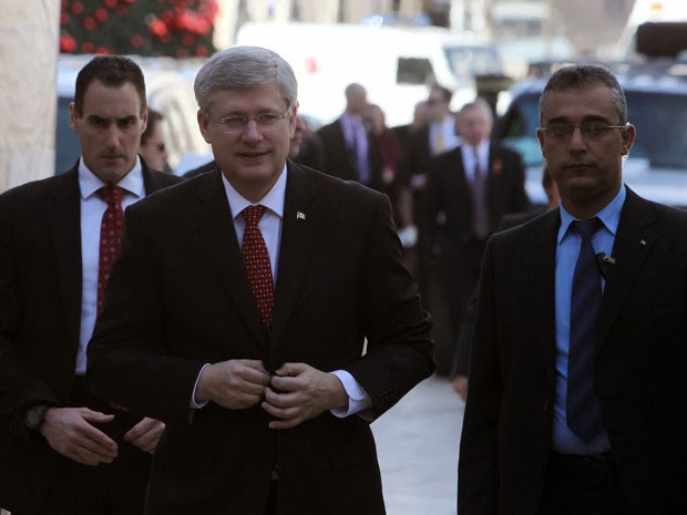 Canadian Prime Minister Stephen Harper (C) arrives to visit the Nativity Church on January 20, 2014 in the West Bank city of Bethlehem. Harper is expected to continue his first official visit to Israel with an a address to the Knesset Israeli parliament before talks with Palestinian president Mahmud Abbas in Ramallah. AFP PHOTO MUSA AL-SHAERMUSA AL-SHAER/AFP/Getty Images