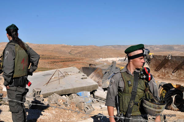 Israeli soldiers stand guard as a bulldozer knocks down the wall of a house in the village of Yatta, near the West Bank city of Hebron, 21 January 2013. The house was reportedly located in a closed military zone where Israel exercises full control, and was constructed without permission. Photo by Mamoun Wazwaz