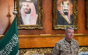 US Marine Corps General Kenneth F. McKenzie Jr., Commander of the US Central Command (CENTCOM), poses for a picture, while standing before a portrait of Saudi Arabia’s founding King Abdulaziz ibn Saud (R) and current Crown Prince Mohammed bin Salman (L), during his visit to a military base in al-Kharj in central Saudi Arabia on July 18, 2019. – McKenzie pledged on July 18 to work “aggressively” to ensure maritime safety in strategic Gulf waters after a spate of attacks blamed on Iran. McKenzie’s visit to Saudi Arabia comes a day after the US House voted to block $8.1 billion in arms sales to the kingdom and other allies, in a move likely to be vetoed by President Donald Trump. (Photo by Fayez Nureldine / AFP) (Photo credit should read FAYEZ NURELDINE/AFP/Getty Images)