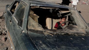 FILE – In this Feb. 10, 2018 file photo, a boy sits in a damaged car in Mocha, Yemen. Envoys from Yemen’s warring parties are headed to Sweden for another round of peace talks to stop the three-year-old war, but with few incentives to compromise, expectations are low for little more than improving a faltering de-escalation. (AP Photo/Nariman El-Mofty, File)