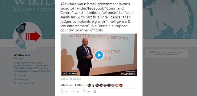 More recently, Israel has been exposed by Wikileaks as hosting a conference describing how it now has a Command Center that uses Artificial Intelligence (AI) to scan the internet worldwide looking for “anti-Semitic” content. For Israel, anti-Semitic content means any criticism of its government or its behavior towards the Arabs. It reportedly pulls 200,000 posts a day and then reviews them using AI for content considered to be unacceptable. The roughly 10,000 posts determined to be anti-Semitic are then passed on to “intelligence and law enforcement agencies” in countries that have hate speech legislation for further action. The Israeli government also complains directly to the social media source to have the material taken down and works through Jewish organizations in cities and countries where there is considerable “anti-Semitic” activity to pressure governments to act even if there is no legal basis.