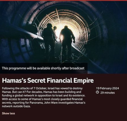 On Monday it aired a programme titled “Hamas’s Secret Financial Empire” headed by reporter John Ware.