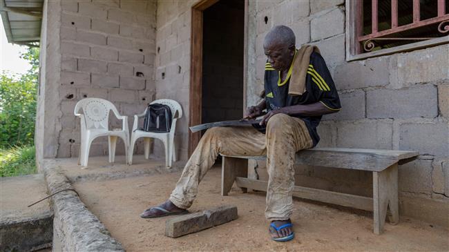 Benoit Bassemel, who’s father was killed during the massacre on the night of December 31 1956, files his machete at his home in Edéa, on December 11, 2019. (Photo by AFP)