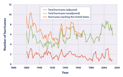 Figure 12: Unadjusted hurricane counts, hurricane counts adjusted for undercounting and hurricanes making landfall in the US