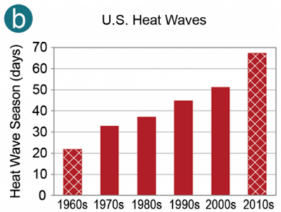 Data from the IPCC and NOAA also demonstrate there has been no measurable increase in the number or severity of droughts, hurricanes or floods, since the early part of the 19th century. Also, data from the IPCC and NOAA show the incidences of heatwaves [see the figure below] and wildfires in the United States and globally have actually declined during the recent period of modest warming.