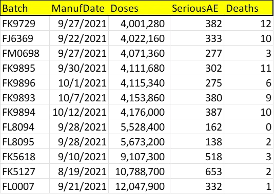 Table below lists all batches >4 million doses, including their date of manufacture and the number of serious adverse events and deaths reported for them in VAERS: