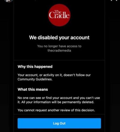 The Cradle’s social media team was informed that they “cannot request another review of the decision,” effectively making the suspension indefinite.
