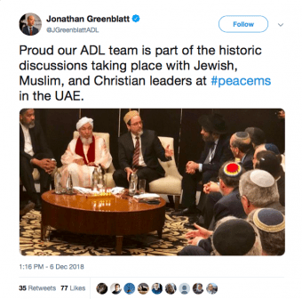 During the conference, the same Muslim figures were photographed in a meeting with several leading members of the Zionist-Jewish American community including representatives of the American Jewish Committee (AJC) and the Anti-Defamation League (ADL), a powerful pro-Israel lobby organization whose dark history of domestic spying and investment of millions of dollars to extinguish all criticism of Israel is documented in a 2014 report by AMP. The photo, which was widely tweeted on Friday by ADL CEO Jonathan Greenblatt, features Sh. Hamza Yusuf, a California-based scholar who has been described by the Guardian as “arguably the West’s most influential Islamic scholar,” and Imam Mohamed Magid, the former president of the Islamic Society of North America (ISNA), who serves as the Executive Imam of the All Dulles Area Muslim Society (ADAMS) Center in Virginia.