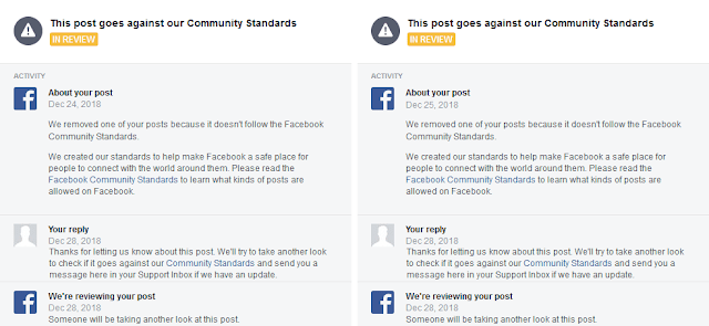 Of course, one should always protest and complain using the due procedures. After all, Facebook has been known to restore such Pages after the public outcry following their removal without proper reason (TeleSur, VenezuelAnalysis, etc.). I did protest, and I am still expecting an answer from them, without much hope, since earlier appeals as old as September 17th are still awaiting a response almost 4 months later, as shown below (screenshot dated January 4th, 2019).