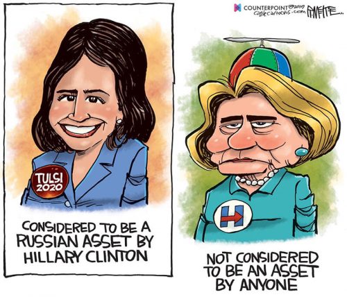 Just kidding – the Democratic Party and its media handmaidens bargained away their morals long ago. They’re aiding and abetting a Clinton comeback, wheeling her out to give her opinion on everything from the latest steps toward peace in Syria (bad, needs more war) to the 2020 candidates. Last week, she took aim at Tulsi Gabbard, the best hope the party has of getting voters excited enough to show up in 2020, claiming (without a shred of evidence) that the National Guard major and former DNC chair is being groomed by Russia to act as a third-party spoiler, handing the election to Trump. Had such a claim come from anyone else, the DNC would have slapped it down. But they know on which side their bread is buttered. They’d rather lose than defy their queen.