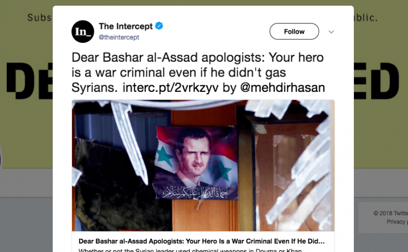 In The Intercept, columnist Mehdi Hasan wrote an impassioned open letter addressed to ‘those of you on the anti-war far left who have a soft spot for the dictator in Damascus: Have you lost your minds? Or have you no shame?’ The piece began: