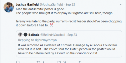 I’m disgusted that this banner was displayed near our #Lab19 conference centre. We asked the police to remove it and I’m glad they did. This kind of antisemitic poison has no place whatsoever in our society.”