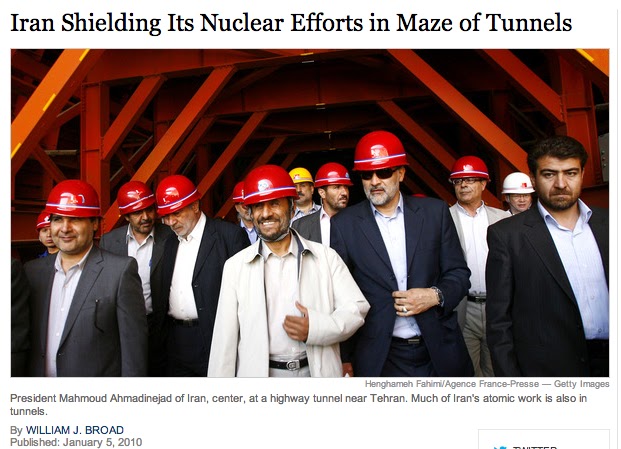 Later in his report, Broad describes Iranian President Mahmoud Ahmadinejad as a tunnel aficionado and quotes Greg Duckworth, a “civilian scientist” described as having “recently led a Pentagon research effort to pinpoint enemy tunnels,” as saying, “Deeply buried targets have been a problem forever. And it’s getting worse.”