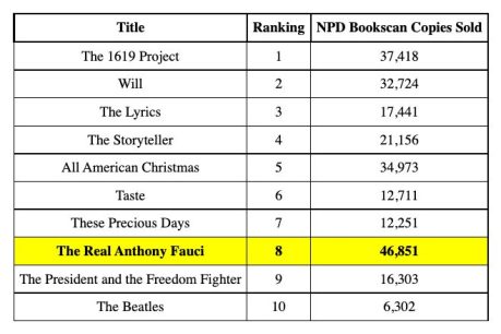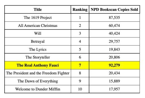 That’s four-and-a-half times as many copies as two of the books ranked ahead of “The Real Anthony Fauci,” and more than double the average of all the books ranked ahead of it.