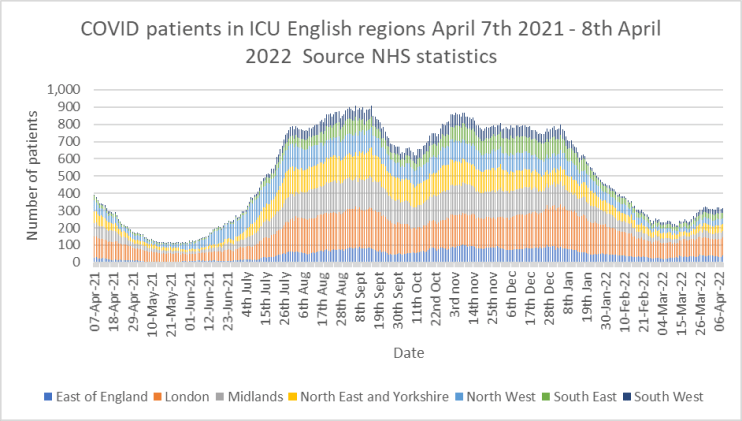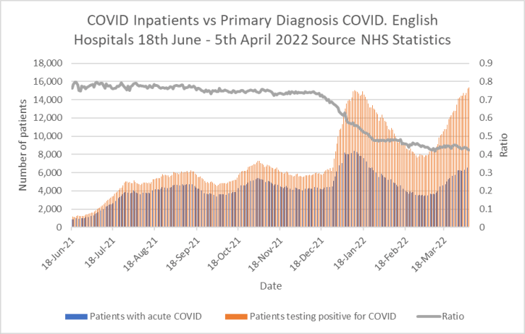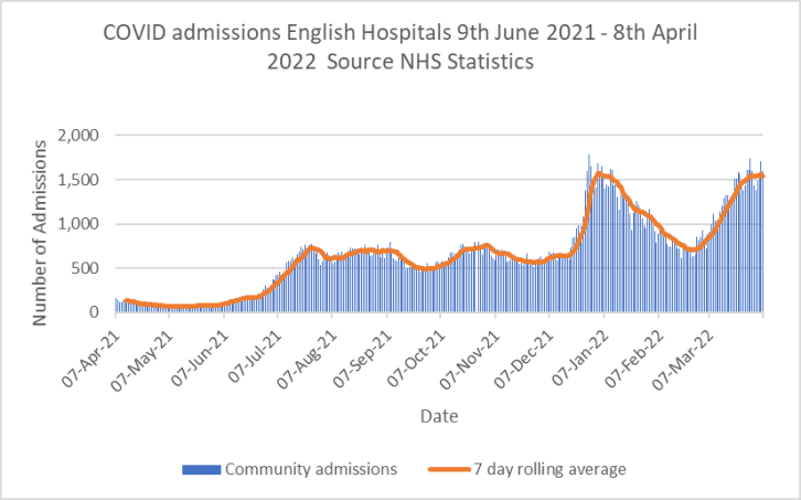Graph 1 shows daily admissions of Covid positive patients from the community. Admissions have risen in the last few weeks, but seem to be tailing off. Data from Graph 1 have been the subject of hysterical articles in the mainstream press implying the latest Omicron BA.2 subvariant may be triggering a new wave of acute Covid infections. It’s not sensible to interpret Graph 1 as a stand-alone figure without considering contextual information from other datasets.