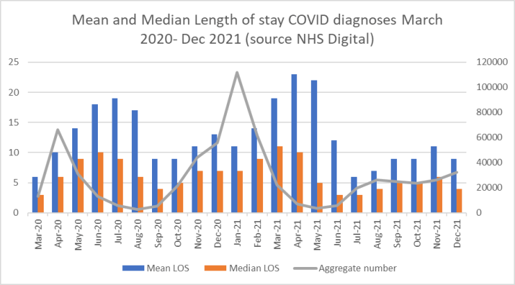 Graph 4 is very instructive. It shows the average length of stays of Covid patients up to the end of December 2021. This data was released in March and unfortunately is only complete up to the end of 2021, but it is reasonable to infer that current length of stay is unlikely to be worse now than in December of 2021, due to increased availability of new monoclonal antibody drugs which reduce disease severity for the highest risk patients. Graph 4 expresses average length of stay as the mean average (blue bars) and the median average (orange bars). Both these averages are steadily reducing with the median length of stay being down to four days by the end of December 2021. For the information of statistically curious readers, the median average in this case is probably more representative of the situation as the mean average can easily be skewed to the upside by a small number of very long-stay patients.