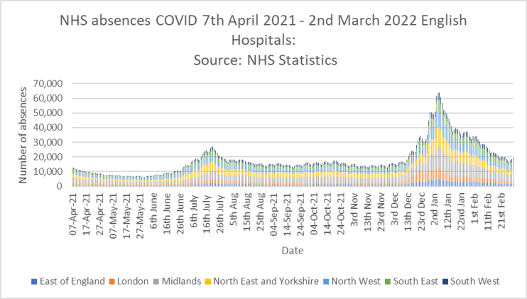 Last week Saffron Cordery, deputy CEO of NHS providers, commented that staff absences played a part in the current crisis. Graph 5 shows the data for Covid related staff absences up to March 2nd (the latest figures released) – they don’t seem to have changed much lately and were on a downward trend since the turn of the year. It’s possible they may have started to increase again, but the figures are not yet released for public scrutiny.
