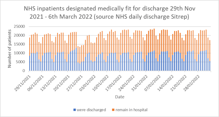 My personal suspicion is that Graph 6 shows the main issue causing trouble in hospitals. Graph 6 shows the number of patients in hospitals deemed medically fit for discharge. It is shown as a stacked bar chart, so the blue bar represents the patients who actually were discharged and the orange bar shows patients who were fit for discharge but had to remain in hospital for administrative reasons (often referred to as ‘bed blocking’). Readers will readily notice the ‘weekend effect’ in the figures, and that about 11,000 patients per day are in hospital when they are fit to be discharged – about 10% of the total NHS bed stock.