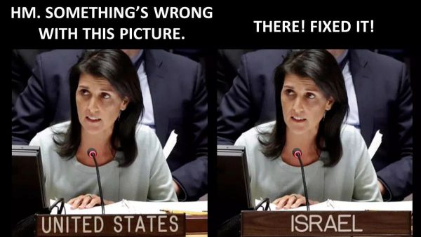 Nikki Haley’s embrace of Israeli points of view is unrelenting and serves no American interest. If she were a recruited agent of influence for the Israeli Mossad she could not be more cooperative than she apparently is voluntarily. In February 2017, she blocked the appointment of former Palestinian Prime Minister Salam Fayyad to a diplomatic position at the United Nations because he is a Palestinian. In a congressional hearing she was asked about the decision: “Is it this administration’s position that support for Israel and support for the appointment of a well-qualified individual of Palestinian nationality to an appointment at the U.N. are mutually exclusive?” Haley responded yes, that the administration is “supporting Israel” by blocking every Palestinian.