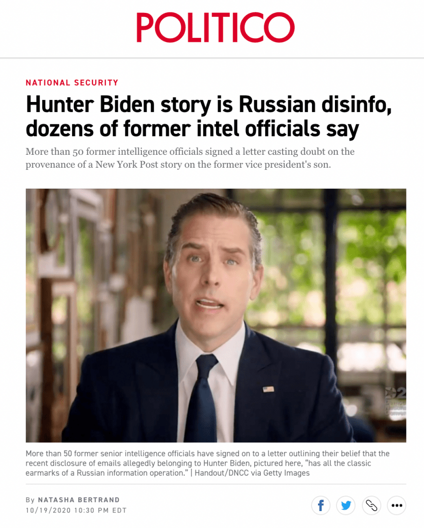 It was this Politico article by Bertrand that was then used by Facebook and Twitter to justify their joint censorship of the Post‘s reporting in the weeks before the 2020 election, and numerous media outlets — including The Intercept — gullibly told their readers to ignore the revelations on the ground that these authentic documents were “Russian disinformation.” Yet once it did its job of helping defeat Trump, that claim was debunked when even the intelligence community acknowledged it had no evidence of Russian involvement in the appearance of these materials, and Hunter Biden himself admitted he was the subject of a federal investigation for the transactions revealed by those documents.
